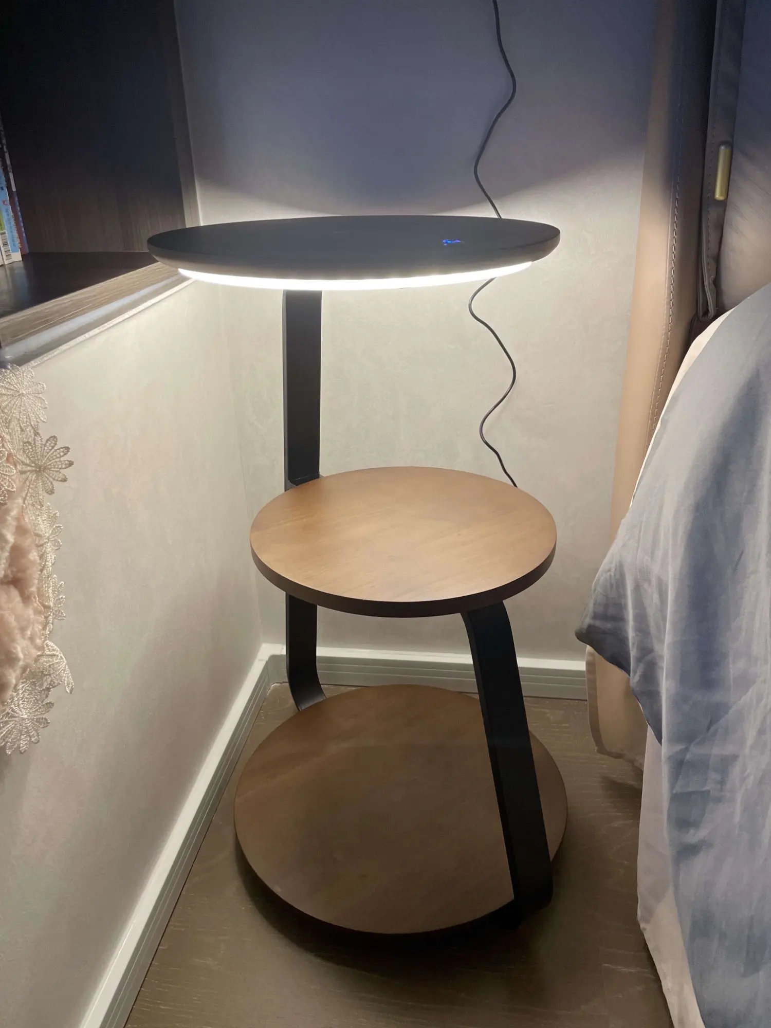 Designed for modern homes, the lamp includes a built-in shelf, ideal for placing books, decor items, plants, coffee cups, or small accessories. With dual light sources and a touch on/off switch, it creates a warm and cozy atmosphere while saving space and enhancing interior style.