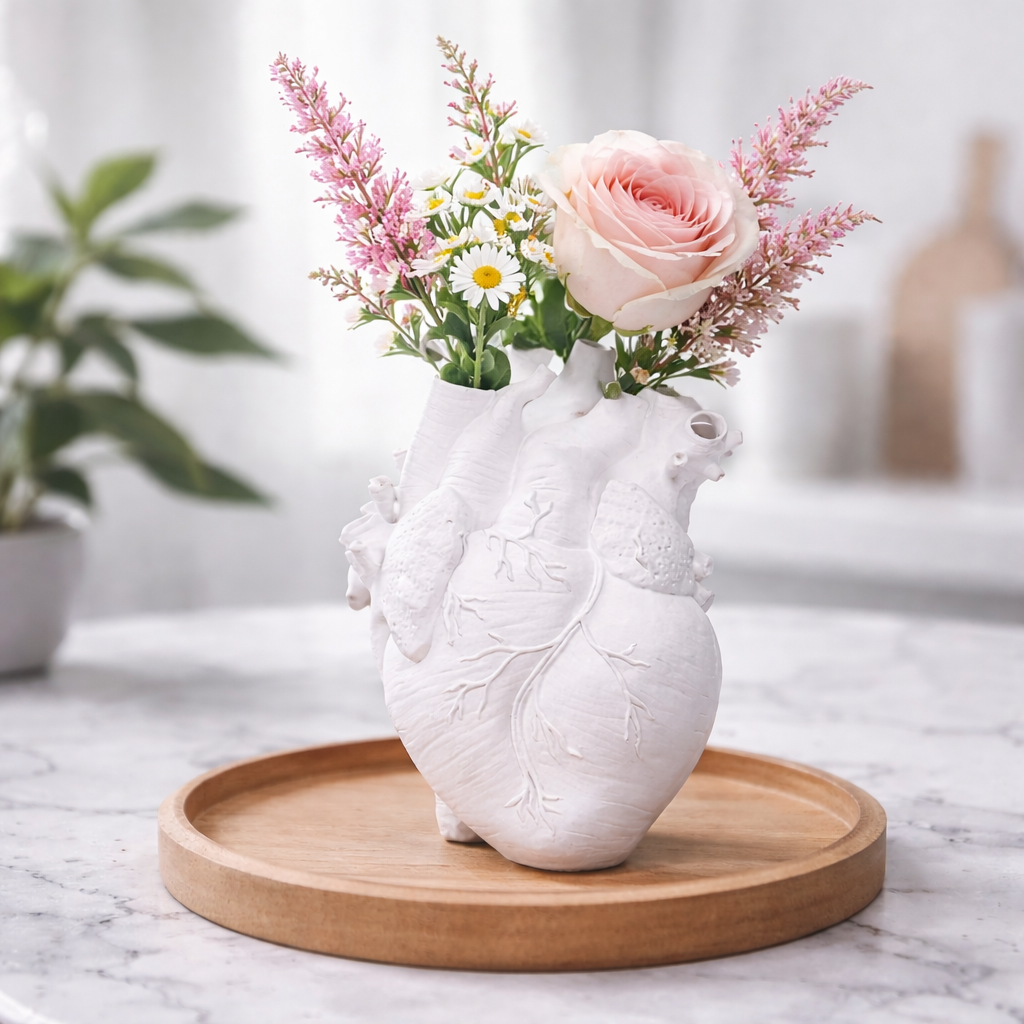 Create a bold and artistic accent in your interior with the Nordic Anatomical Heart Vase — a unique decorative flower pot inspired by realistic anatomy and modern Nordic design. This sculptural vase in the shape of a human heart is crafted from high-quality resin, combining artistic aesthetics with functionality. Its unusual anatomical design makes it a striking statement piece for modern, minimalist, gothic, industrial or creative interiors. Perfect for dried flowers, artificial plants, small bouquets or as a standalone sculpture, this heart-shaped vase instantly transforms any tabletop, shelf or desk into an art installation. Whether placed in a living room, bedroom, office or studio, it adds depth, character and avant-garde style to your space. Ideal for art lovers, designers and those who appreciate unconventional home decor.